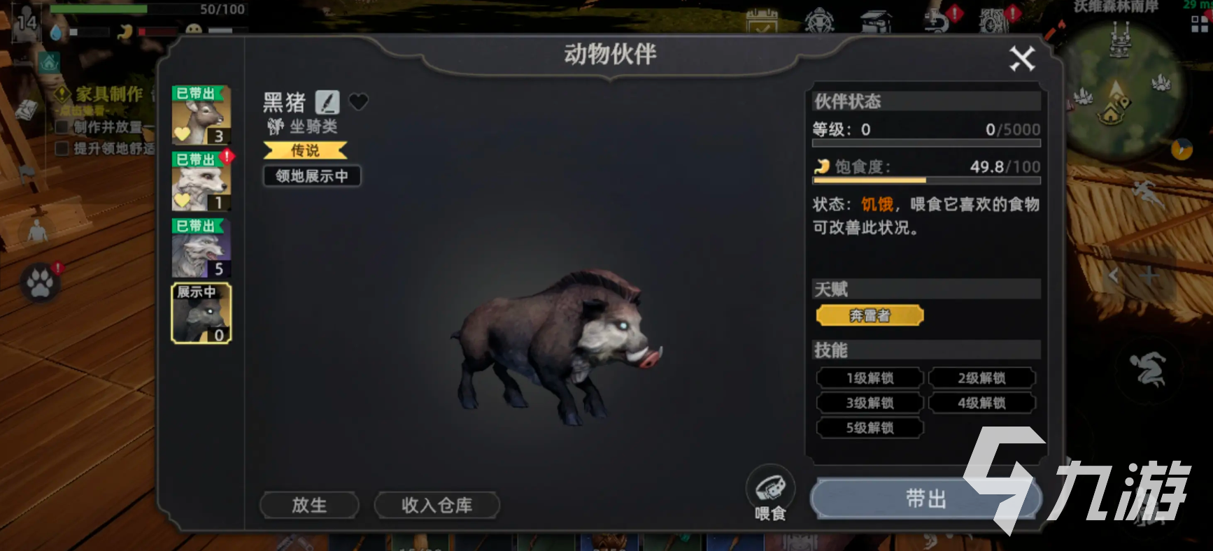 同时还需要注意,有些野猪会进行变异,变异后的它会更加强大,一定要将其打到残血状态,此时使用捕捉道具,就能更简单的将其抓获,这时候就成为自己的宠物了。此时就可以给野猪安装鞍具,野猪是有冲撞和辅助技能的,可以骑乘它去采集资源,可冲撞岩体之类的。