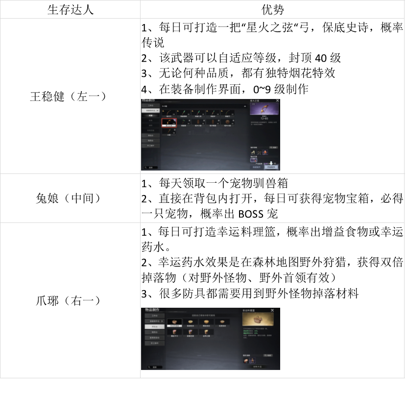 三位生存达人各有优势,探险家可以根据自身情况选择,同时达人旁边的问号也有详细说明。
