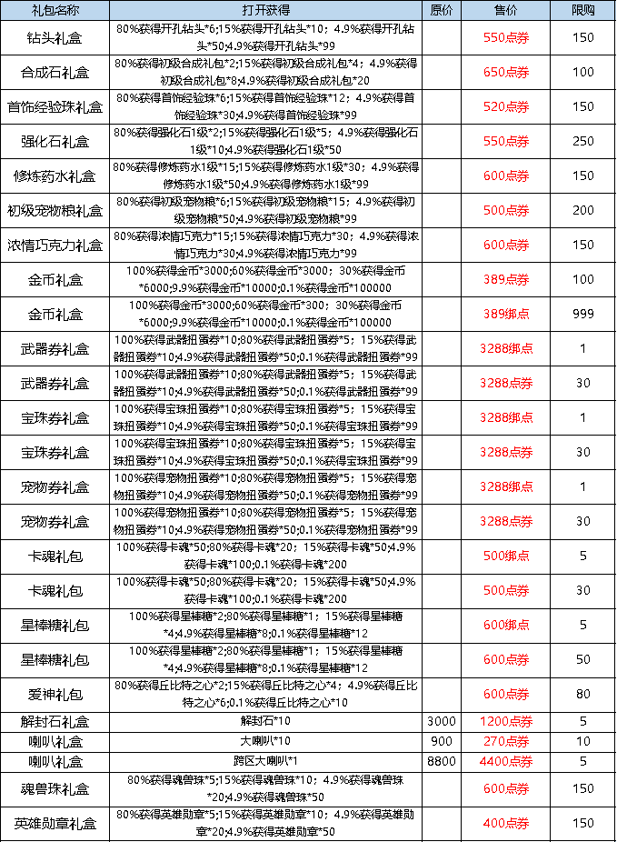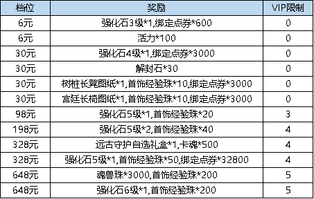 活动规则:6元强化石礼包、活力礼包、30元强化石礼包每日重置刷新,其余礼包每周限购1次。