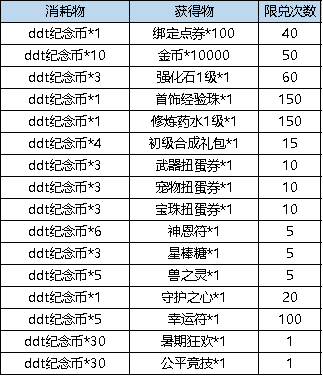 活动规则:消耗ddt纪念币,兑换好物,每档兑换均有不同次数的限制。