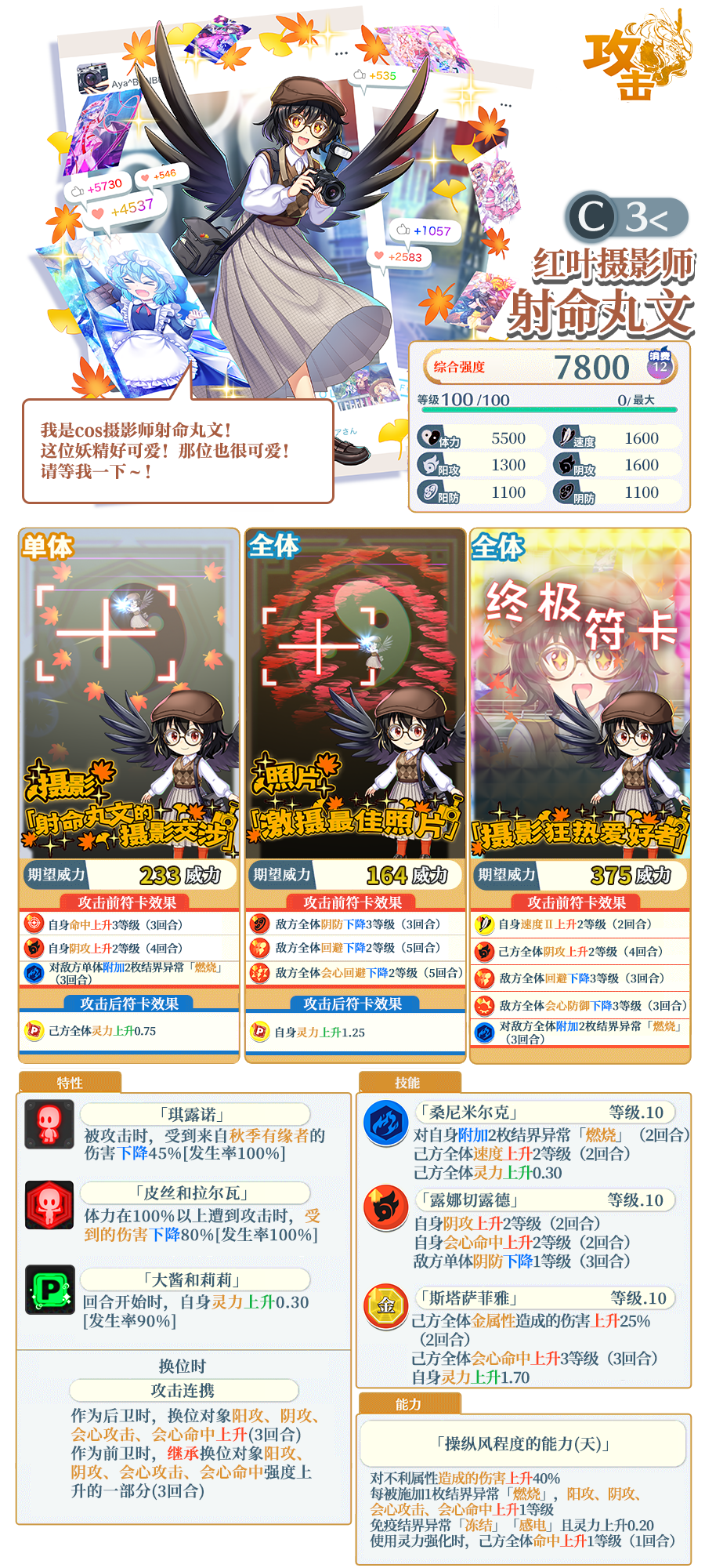 ※「[红叶摄影师]射命丸文」是仅在EPIC限定祈愿中登场的角色。