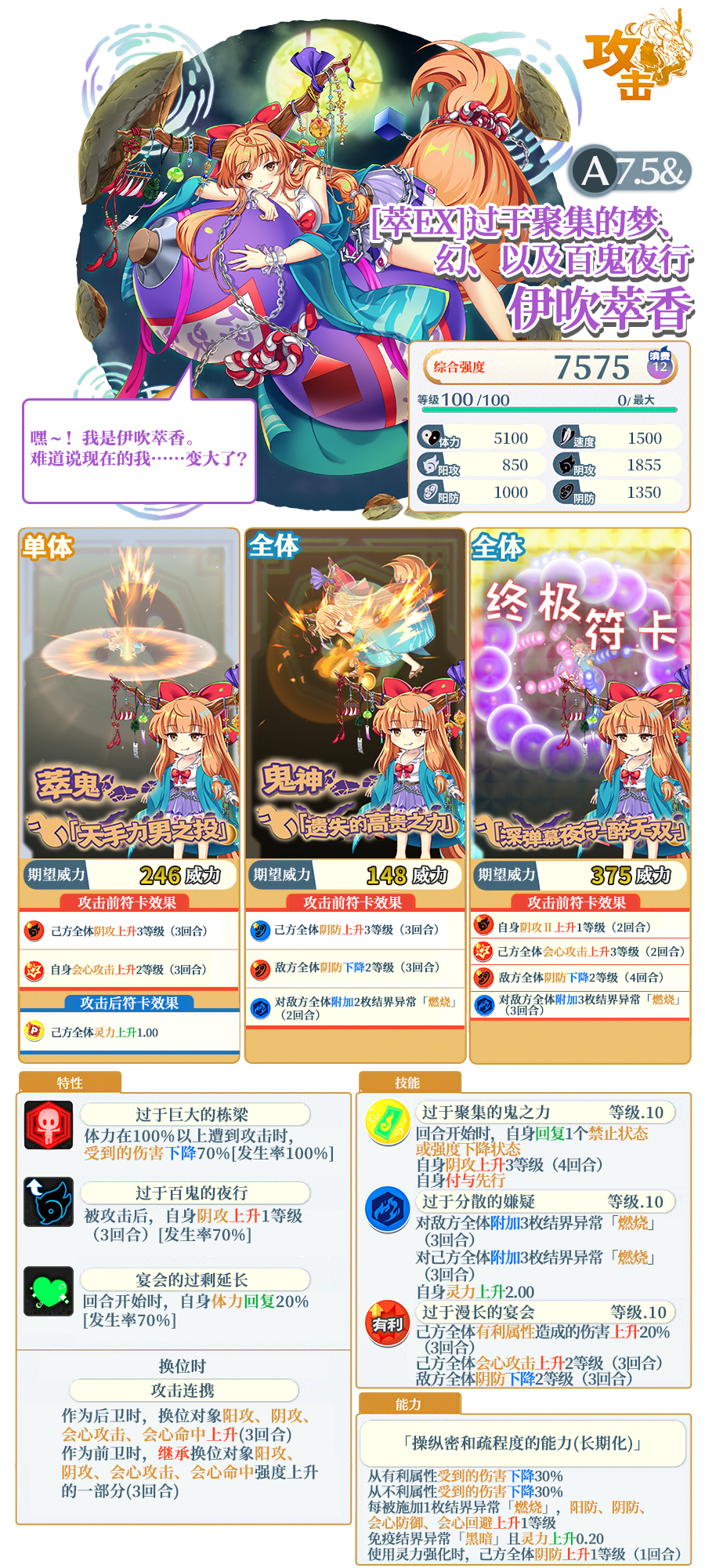 ※「[萃EX]过于聚集的梦、幻、以及百鬼夜行 伊吹萃香」需要使用同名伙伴或者「大替身」进行界限突破。不同泛异记号的伙伴、「大替身」以外的替身无法对其进行界限突破。