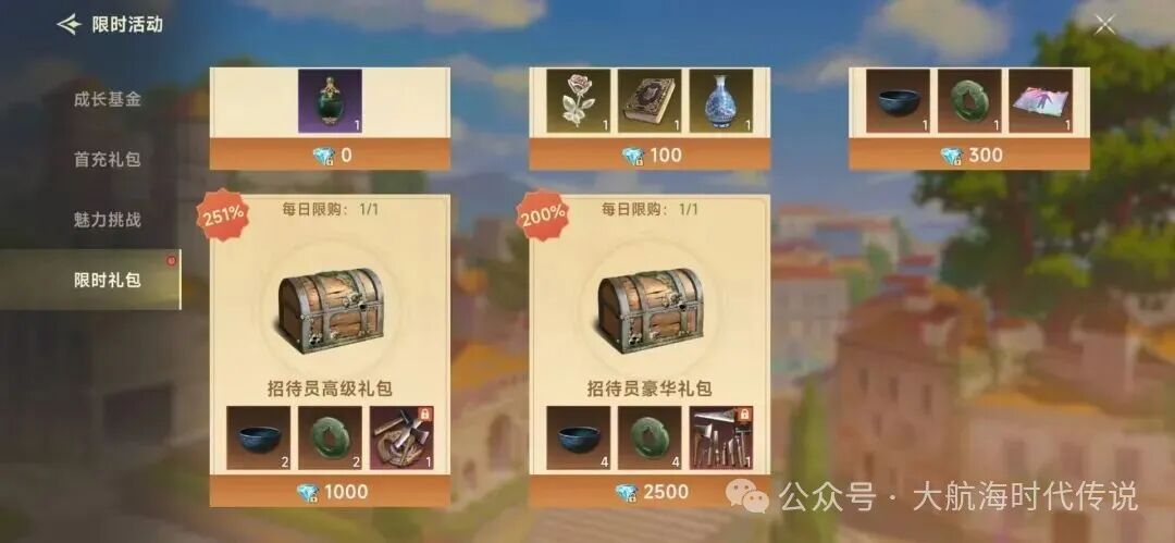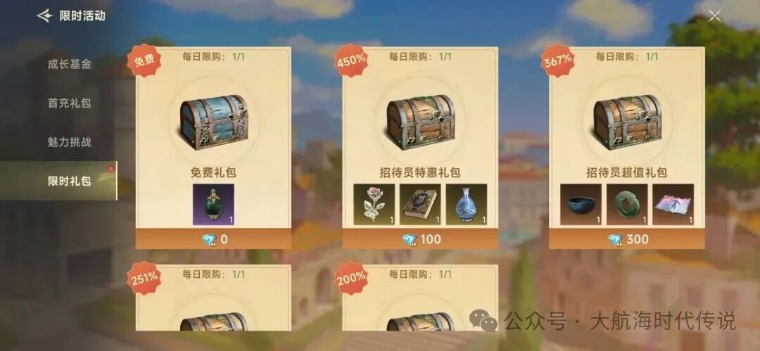 限时上架多款折扣礼包,包含蔷薇香水、冰冻的玫瑰、萨福的诗集、黑琉璃碗、古代玉器、名匠造船工具等道具~