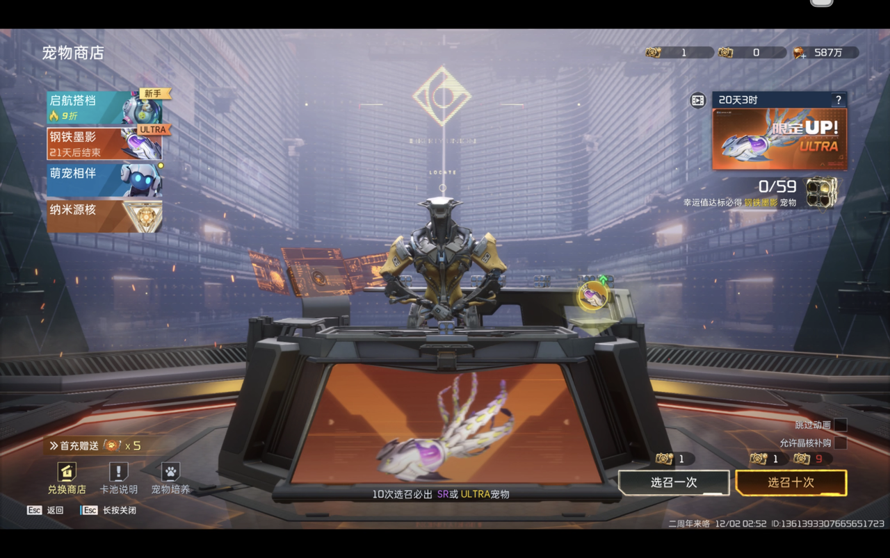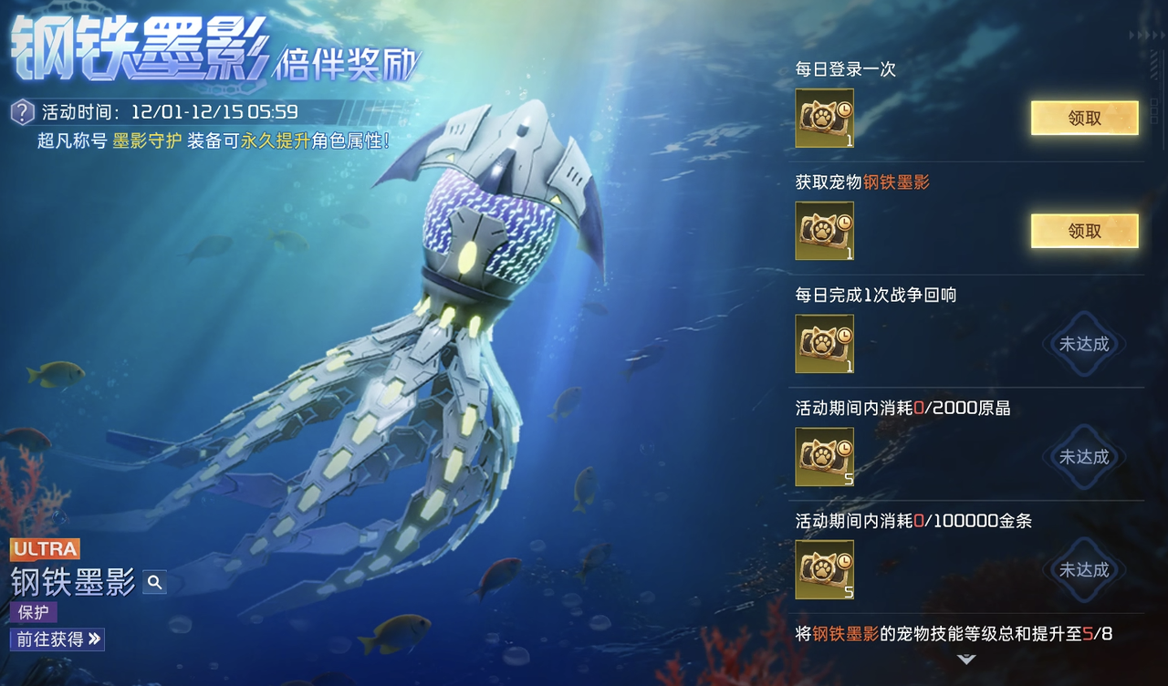 12月01日-12月22日「钢铁墨影」限定选召限时开启,“钢铁墨影”将作为ULTRA的限定UP宠物出现。当在对应卡池内选召获取到ULTRA时,100%的概率为本期UP宠物!