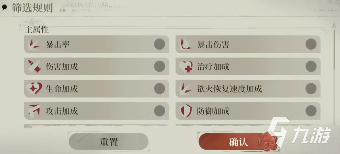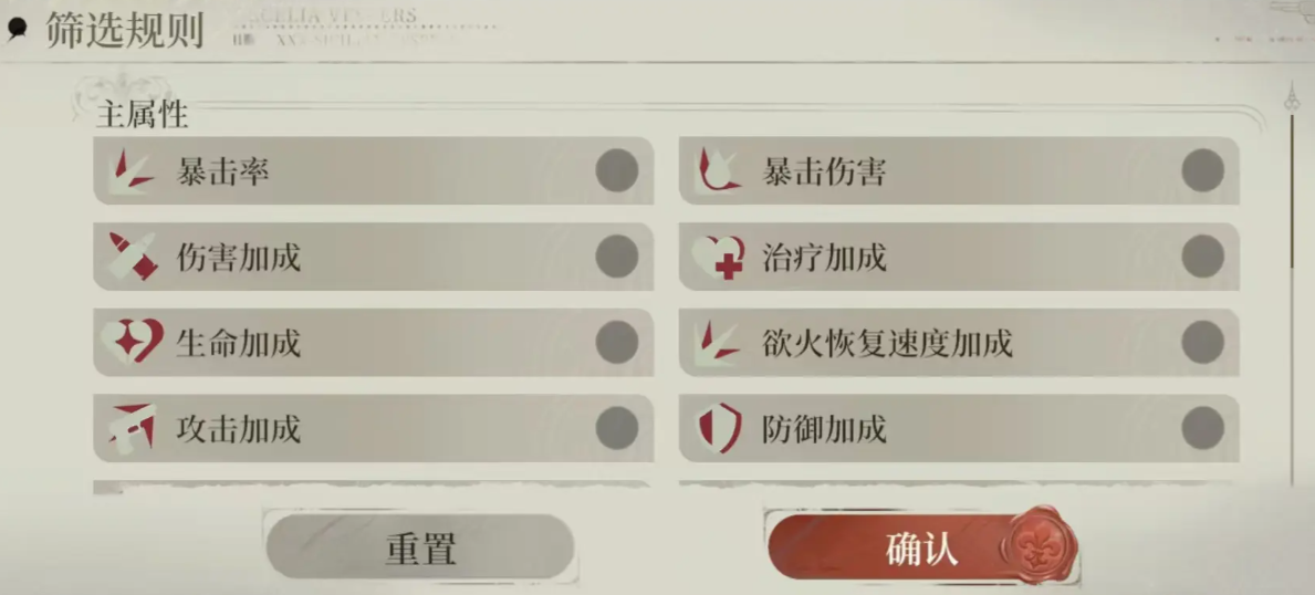 “装备”被称为藏品,每位角色可装5个坑位的藏品,藏品最高品质为满级16。装备构成包括两件套或四件套效果,同时每个栏位具有主、副两种属性:1号、2号位为固定的,3~5号位则为随机的。每个位还有四条副属性。提升藏品的方法目前主要是“吃”低星级的藏品,因此在早期阶段积累大量低星藏品。