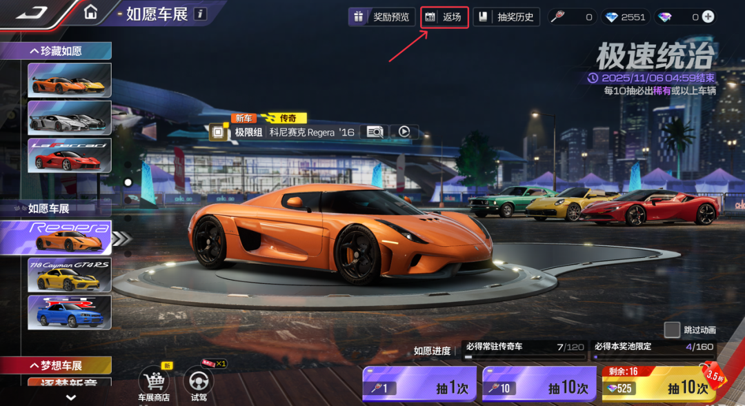 车手们只需进入【巅峰车展】中的珍藏如愿车展、如愿车展,或是积分车展页面,点击“返场”按键,近期的返场车(非新车)情况就能全看清!(想蹲新车情报?那还得盯紧小可的最新动态呀~)