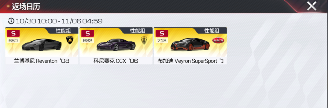 返场车辆:【性能组】典藏传奇车辆兰博基尼 Reventon '08、【性能组】珍藏传奇车辆科尼赛克 CCX '06、【性能组】珍藏传奇车辆布加迪 Veyron SuperSport '10