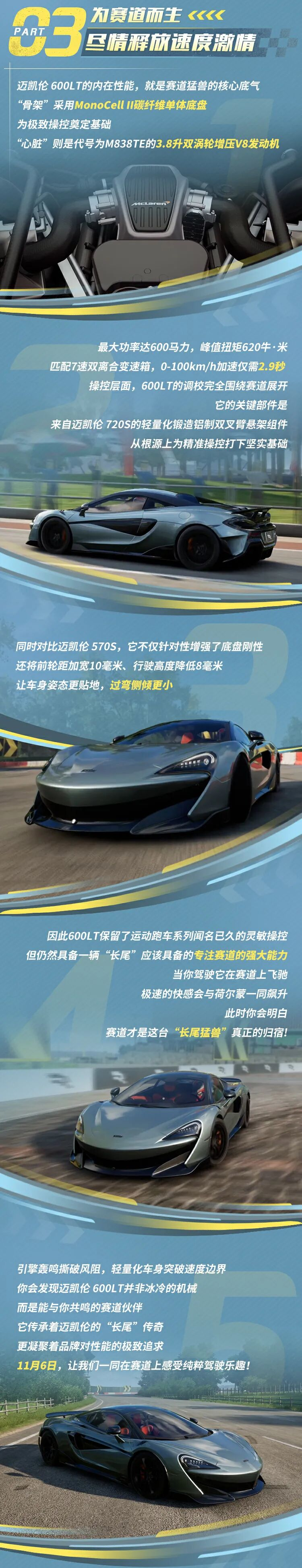 11月6日巅峰爆改节正式开幕,这台即将在下半赛季和各位车手见面的座驾,正是迈凯伦“LT(LongTail)”长尾车系第四代成员——【性能组】传奇车辆迈凯伦 600LT '18!