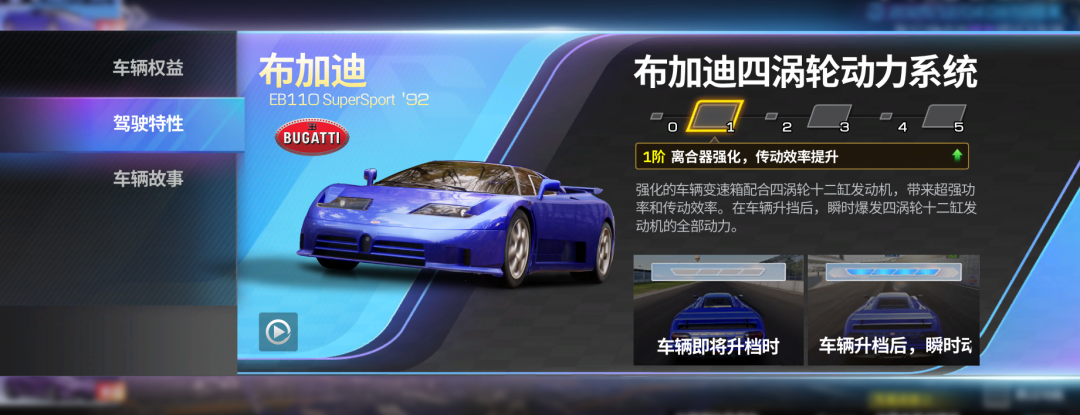 在《巅峰极速》中,随着车辆ECU阶数的提升,布加迪 EB110 Super Sport的四涡轮动力系统也会有相应的强化。在1阶时,其离合器也会进行强化,传动效率将会更上一层楼!到达3阶时,涡轮的最大压力将会进行调整,使其输出功率提升!到达5阶时,涡轮系统再次优化,输出功率再次提升!