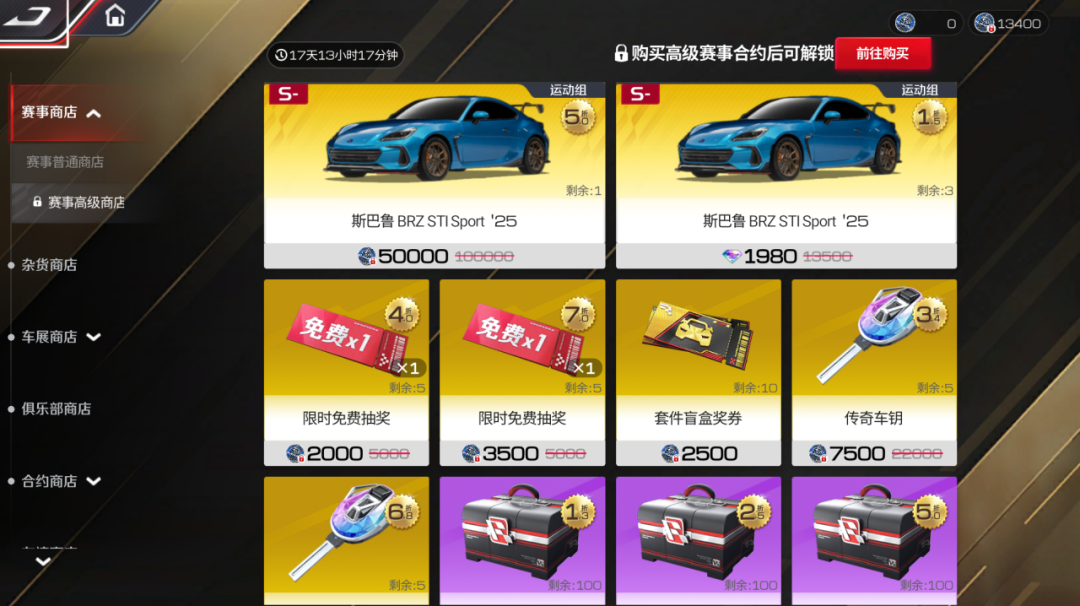解锁高级合约后,达成指定等级还能再直领一台斯巴鲁BRZ STI Sport '25,轻松升阶不在话下!同时还能解锁高级商店权限,可使用竞猜币或宝石为爱车补阶!更有10W竞猜保护额度开启“福利暴走模式”,超多竞猜币等你收入囊中!