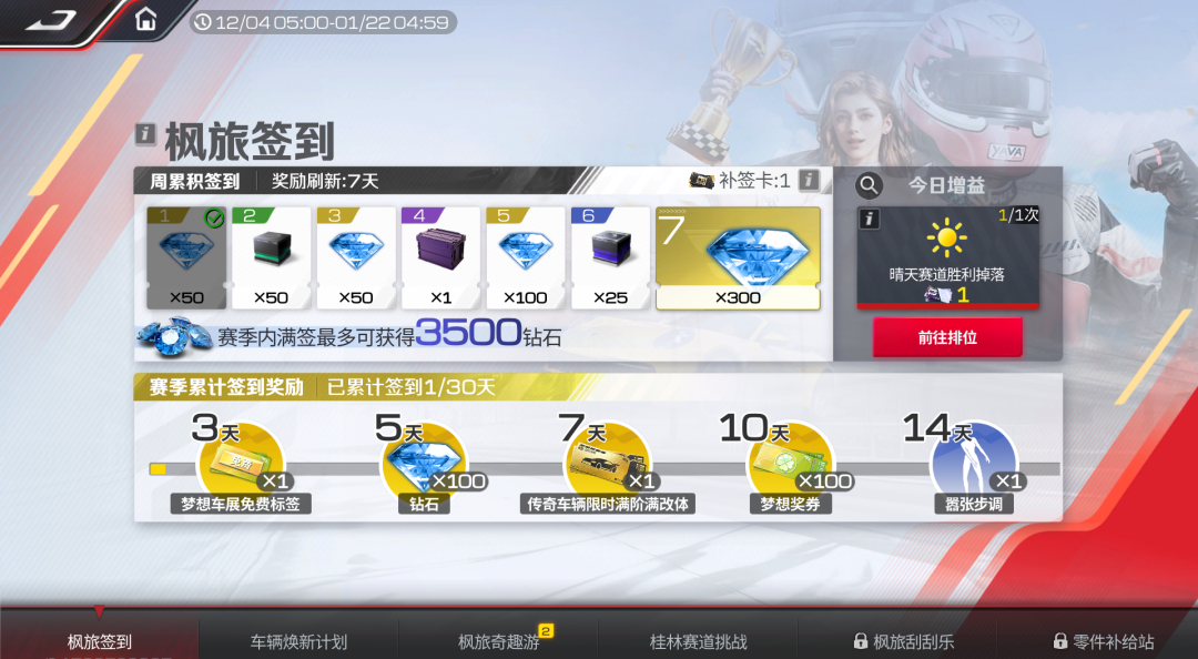 新一轮赛季签到福利上线!全新道具“补签卡”助力,漏签也能拿捏全勤福利!更有梦想车展免费标签、传奇车辆限时满阶满改体验卡、专属动作“嚣张步调”同步解锁,车手们赶紧登录签到领奖励吧!