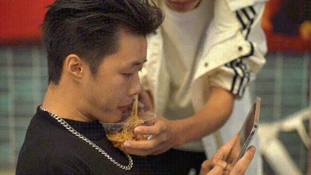 比赛一开始,大学生队就展现出惊人执行力。广西表妹将“喂粉”发挥到极致,喂粉的手根本不停筷,用“快、准、稳”的手法把粉往搭档嘴里“赶”,堪称“嗦粉血脉觉醒”,全程如行云流水,嗦粉速度直接拉满,率先拿下一局!