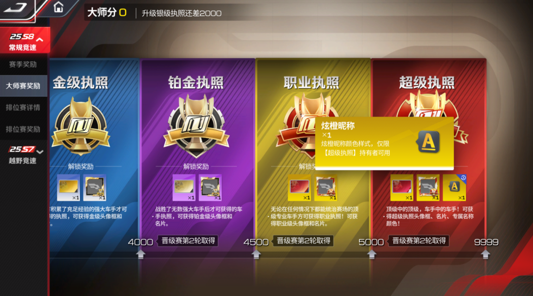当然,通往高等级执照的道路充满挑战与策略。当你拥有金级执照及以上的高级执照且大师分累计达到晋级门槛时,激动人心的 【大师晋级赛】 就将开启!
