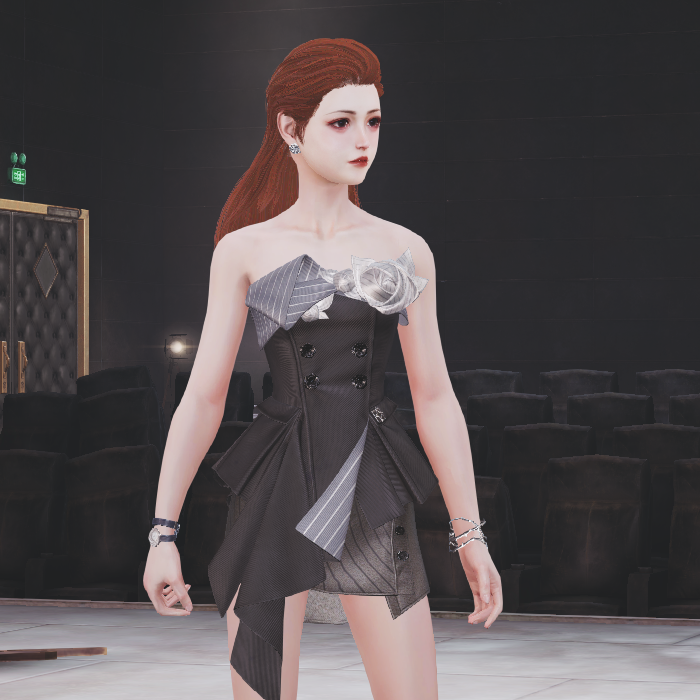 小礼裙将经典西装元素进行了大胆解构。塑形的抹胸上衣点缀着玫瑰状的双排纽扣,视觉核心被聚焦在领口处,灰色竖条纹面料在此展开,绽放出一朵精致的米白色布艺玫瑰。