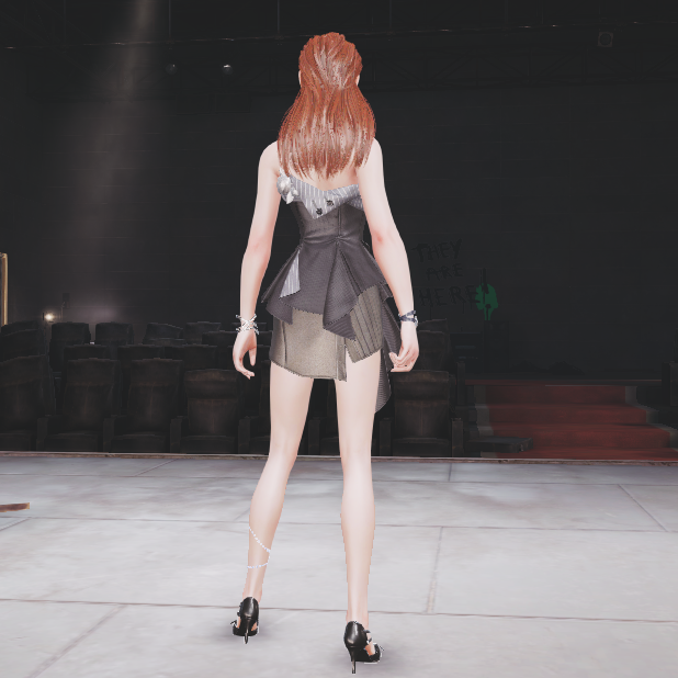 露肩设计勾勒出完美肩颈线条,裙摆如未开花苞般优雅利落,经典的黑色高跟凉鞋以纤细的踝带收尾,步步精巧。