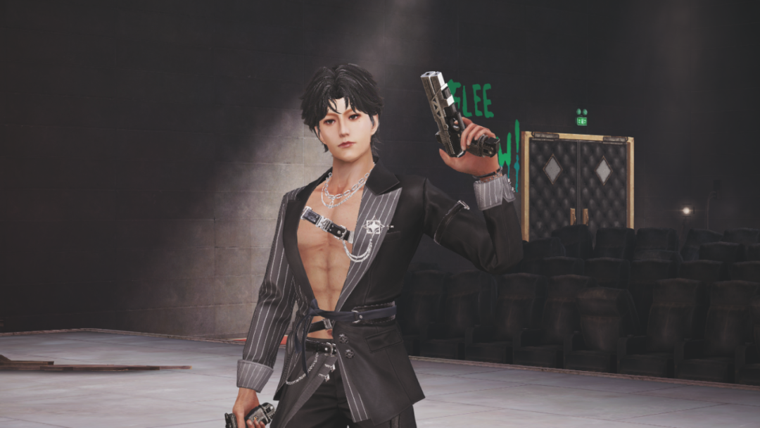深炭黑的发丝间,鬓角与发梢处挑染一缕冷灰。链环分明的项链在颈间焕发光彩,为整体造型奠定了冷峻基调。