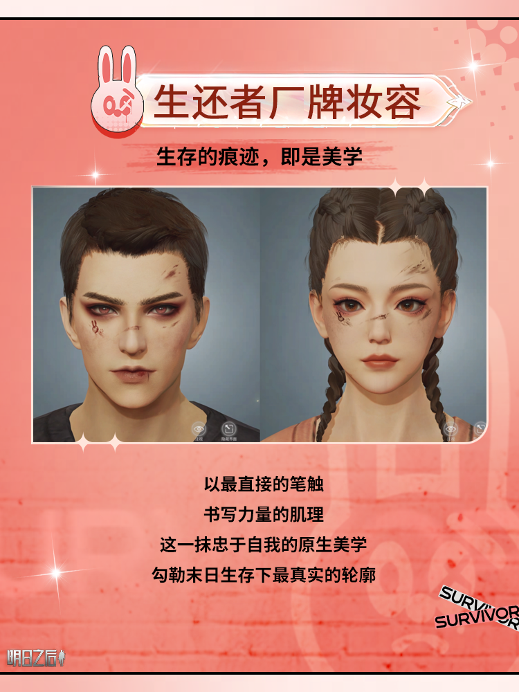 幸存者们持有任一厂牌时装即可自选领取一款专属妆容,也可以通过趣味【厂牌个性测试】找到你的灵魂归属,从最契合你的TOP2推荐中挑选一款。