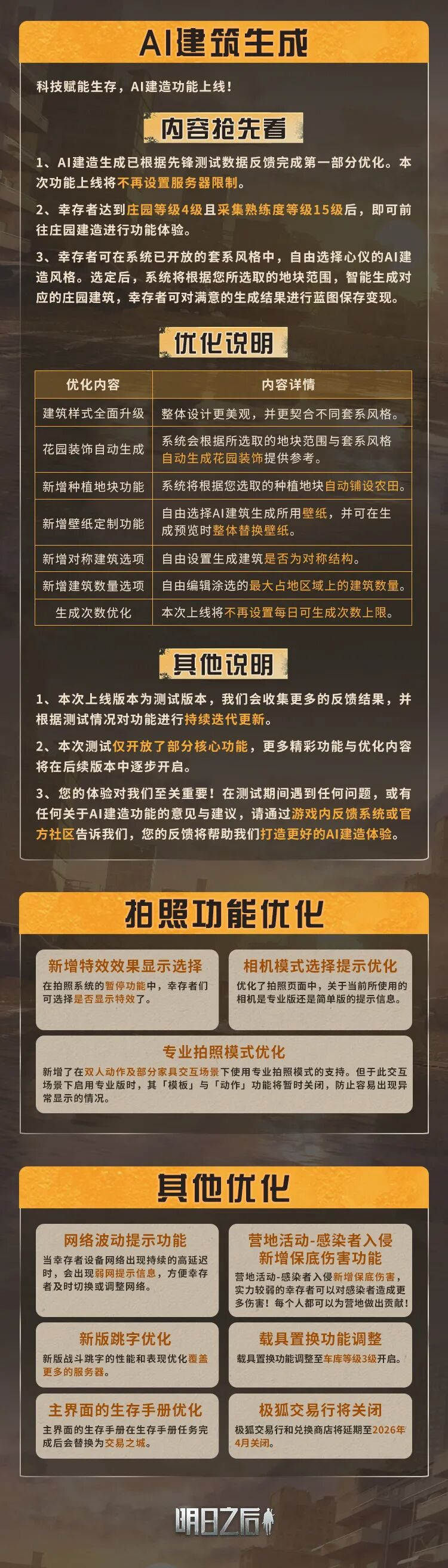 明日之后第八季-极夜星火 存亡之际,希望的火种必须汇聚:将收集的物资运输回防线,与所有幸存者并肩,一砖一瓦共建照亮人类文明的光塔。而当毁灭一切的巨型感染涌来,唯有坚守阵地,用血肉之躯守护星火撕裂长夜,点燃黎明! -保持希望和求生意志 -利用一切活下去 -遭遇更多幸存者玩家 -建起废土里最后的”家”