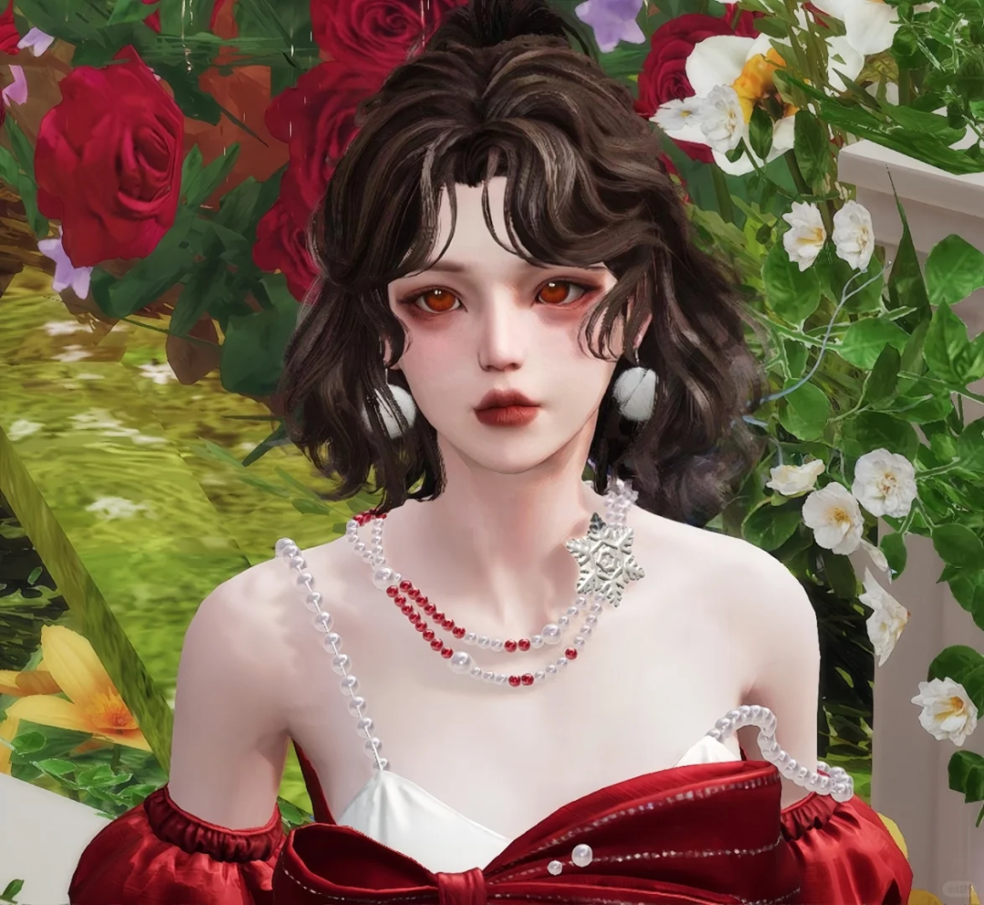 她身披酒红礼裙,胸前缎带与珍珠层叠