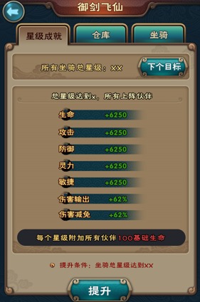 坐骑星级成就:根据所收集到的坐骑星级总和,即可在星级成就界面提升成就,从而加强所有上阵伙伴的各项属性值。