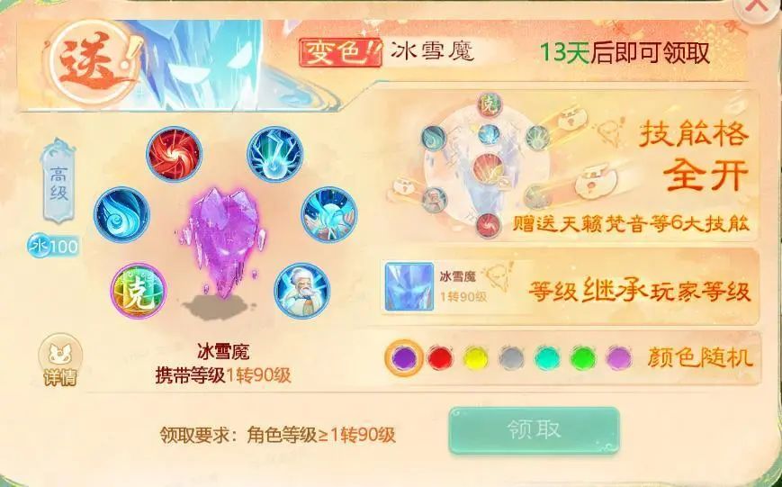 必得变色冰雪魔:角色达1转90级,第15天登录即领!