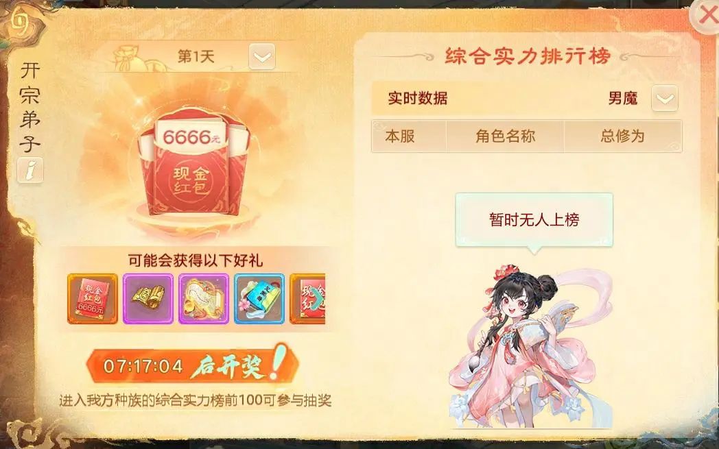 全新门派神裔现世,新服争当开宗弟子!活动期间,每日截止至19:30,综合实力榜每个分榜的前100名侠士,都将成为开宗弟子!每日角逐抽取6666元超级现金红包、一级五行材料、高级藏宝图等丰厚奖励!