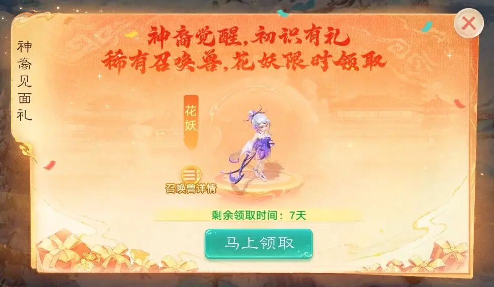 神裔临三界,神裔首发服每个新服都为广大少侠们准备了一只稀有召唤兽:花妖!只要等级达到10级即可领取,伴你游历三界!