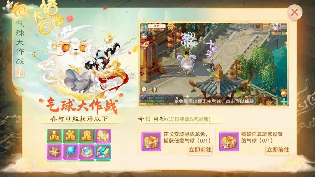 活动期间,龙兔会在长安巡游放飞气球,每日首次捡气球、戳破他人气球即可获得奖励;