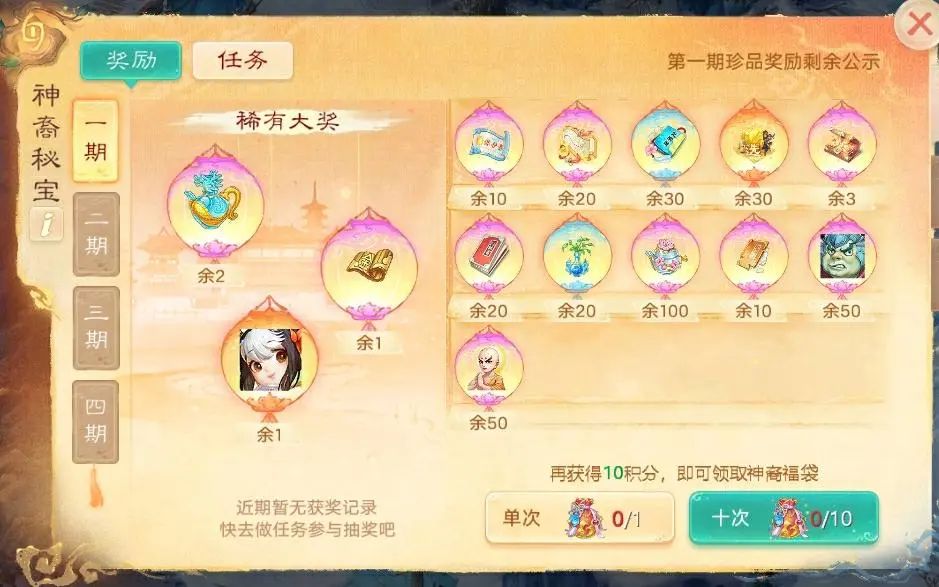 活动期间,少侠只需完成游戏内常规活动或任务,即可获得积分领取神裔福袋,使用神裔福袋开启赠礼即有机会获得龙兔、1级五行材料等惊喜奖励!
