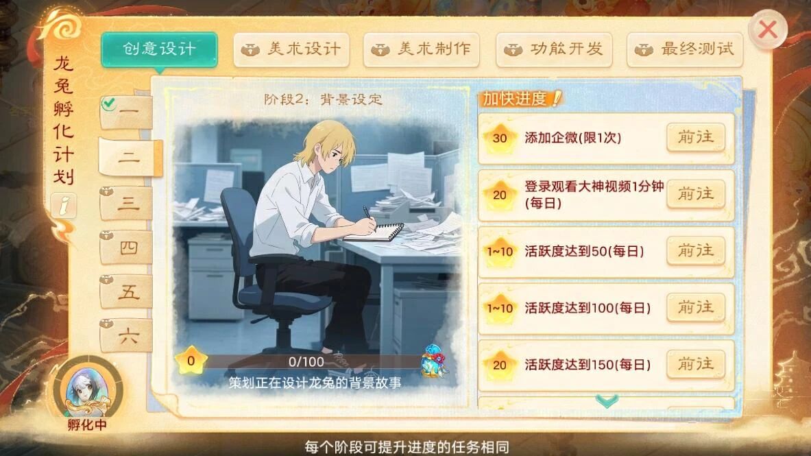 3)每个阶段可提升进度的任务相同,只需完成活跃和培养任务即可达成当日进度上限,不花一分钱;