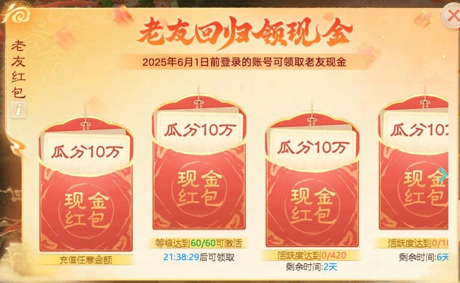 凡入驻本次系列新服的回流少侠(2025年6月1号后至今未登录游戏等级达到1转80级的账号),都可以在游戏中领取五个现金红包,金额1-10元不等(先到先得)。