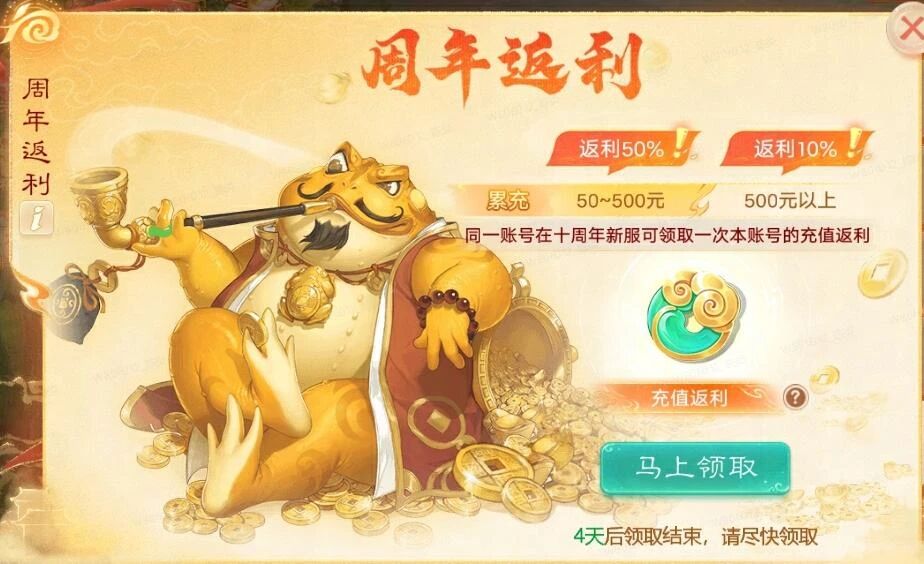 1)历史充值额度在50元及以上,则可以领取返利;(仅可在十周年系列服务器领取一次)