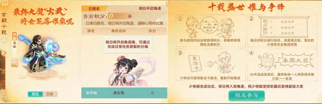 1)报名后次日开启角逐,参与游戏内玩法获得奖励的同时,有概率获得随机数量的玄毅积分;