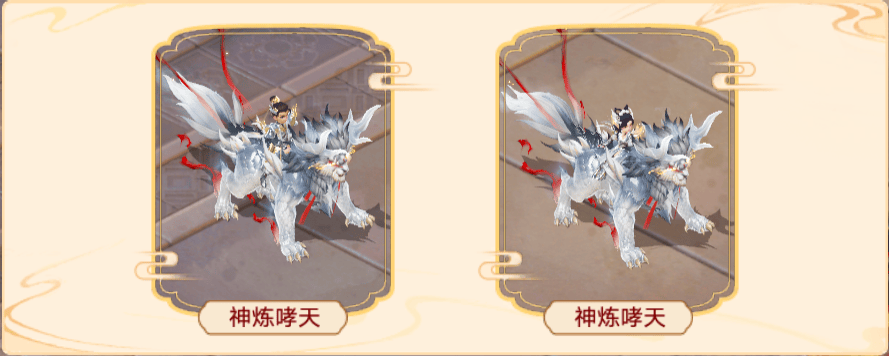 取材自同一神话主题的十周年典藏双人座驾神炼哮天与座驾幻肤盖世哮天同样在庆生盛典中登场——首款拥有“闪现”功能的座驾,龙行虎步、动如奔雷!