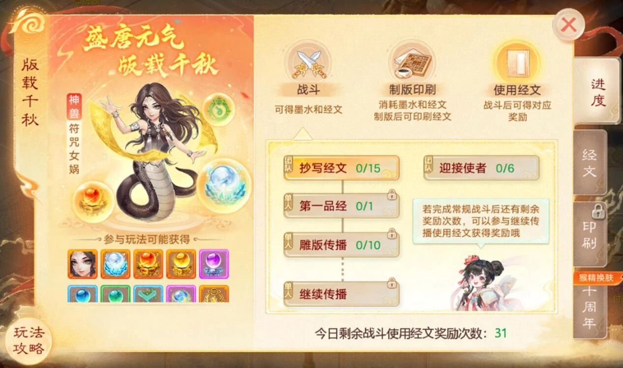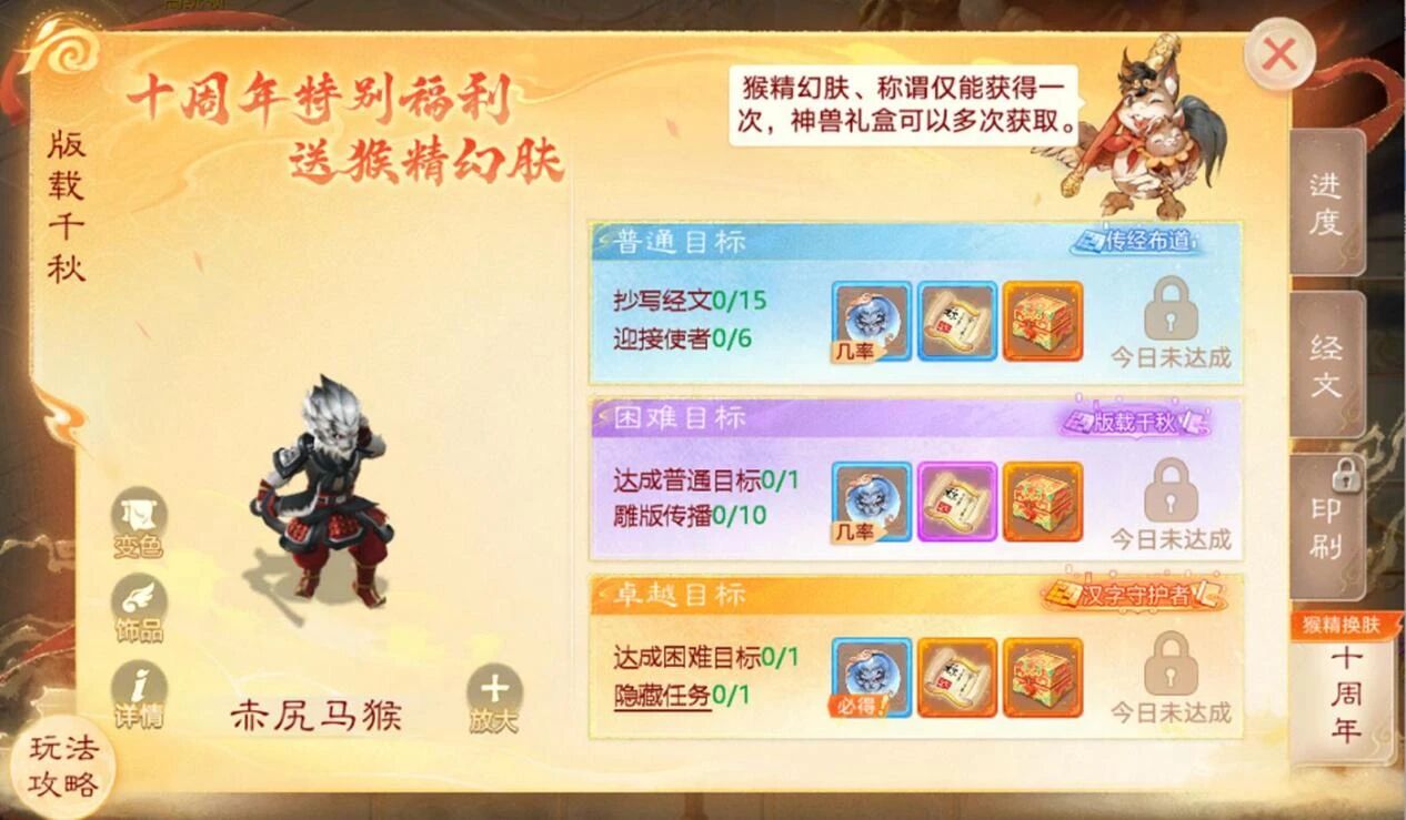 新增版载千秋十周年特典目标,每日完成即可获得限时称谓、猴精幻肤、抽取神兽大奖等豪礼;
