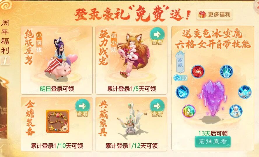 满足1转90级,第15天登录即可免费领走变色冰雪魔,颜色随机,技能全开,自带含天籁梵音等6技能、召唤兽等级继承少侠角色等级!