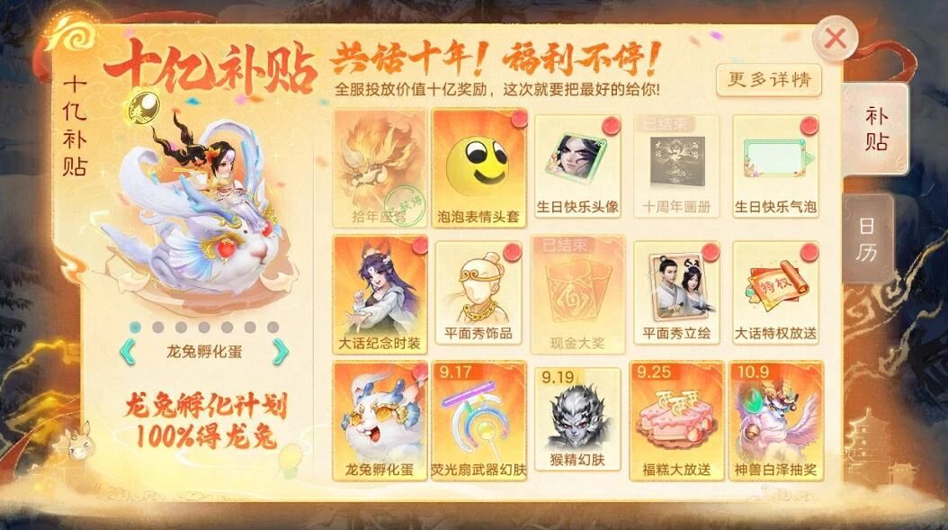 十年相伴,全服豪掷价值十亿福利,只为宠你!座驾、时装、红包、贵重道具奖不停!惊喜福利揭晓:登录即可领取龙兔蛋,孵化成功100%获得龙兔召唤兽!