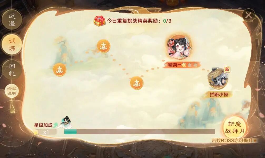少侠需使用活动培养的李逍遥参与挑战,逐步体验“李逍遥”成长之路。