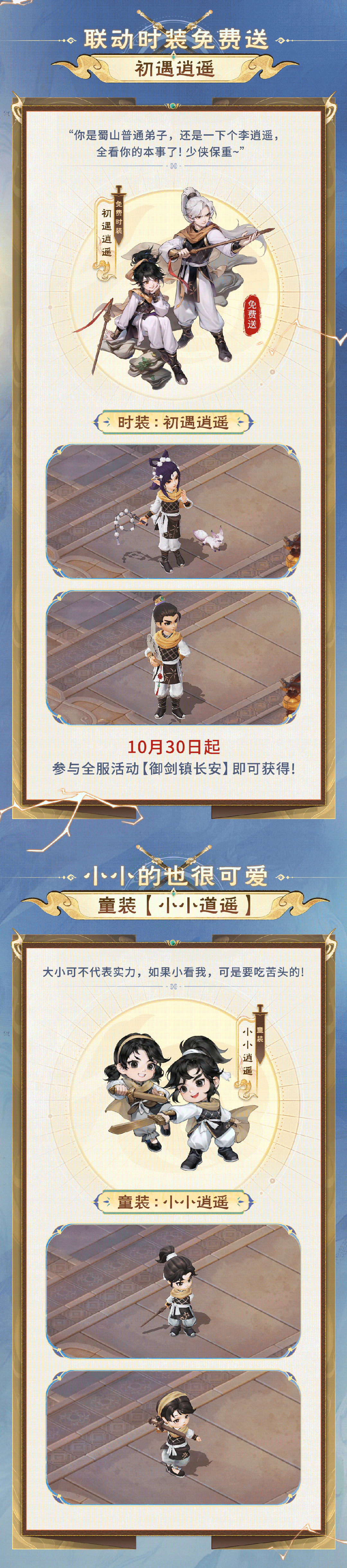 此外,还有武器幻肤“剑神”、玄武幻肤“拜月教主”、赤焰妖幻肤“蜀山魔师”上架,霸气外露,好不威风。更有良品时装“初遇逍遥”、童装“小小逍遥”、伙伴“女娲后人”、空间挂件&队标等联动限定,参与活动即可免费领取!