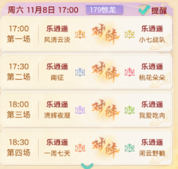 179惊龙组今天将由『乐逍遥』服务器的【风清云淡】对阵【小七战队】,【南征】对阵【桃花朵朵】,【清辉夜凝】对阵【我爱吃肉】,【一周七天】对阵【闲云野鹤】。