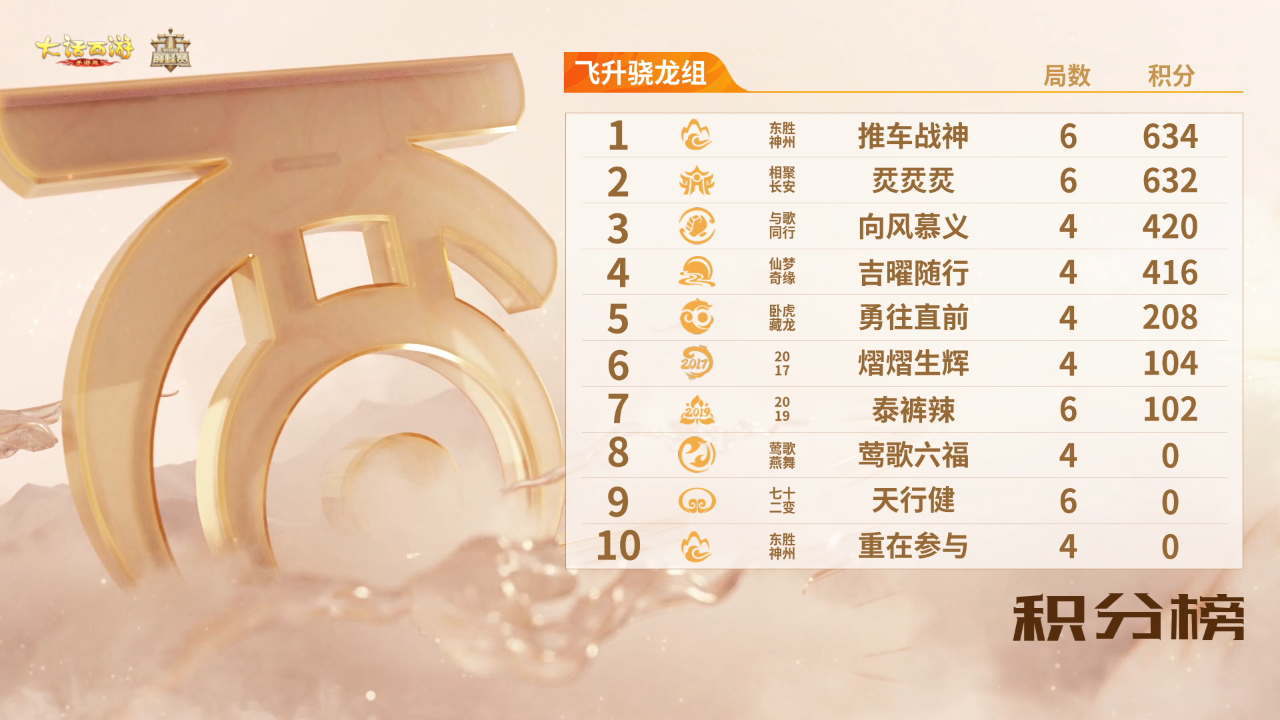 今日19:00,将迎来飞升骁龙组的对决,分别由『东胜神州』服务器【推车战神】对阵『仙梦奇缘』服务器【吉曜随行】,『莺歌燕舞』服务器【莺歌六福】对阵『2017』服务器【熠熠生辉】,『与歌同行』服务器【向风慕义】对阵『东胜神州』服务器【重在参与】,『卧虎藏龙』服务器【勇往直前】对阵『2019』服务器【泰裤辣】。