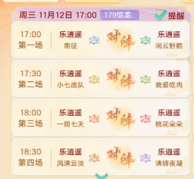 11月12日17:00,将由179惊龙组『乐逍遥』服务器【南征】对战【闲云野鹤】,【小七战队】对战【我爱吃肉】,【一周七天】对战【桃花朵朵】,【风清云淡】对战【清辉夜凝】。
