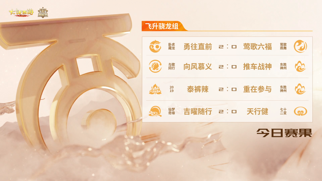 飞升骁龙组的对战由『卧虎藏龙』服务器【勇往直前】对阵『莺歌燕舞』服务器【莺歌六福】,『与歌同行』服务器【向风慕义】对阵『东胜神州』服务器【推车战神】,『2019』服务器【泰裤辣】对阵『东胜神州』服务器【重在参与】,『仙梦奇缘』服务器【吉曜随行】对阵『七十二变』服务器【天行健】。
