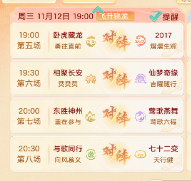 11月12日19:00,将由飞升骁龙组『卧虎藏龙』服务器【勇往直前】对战『2017』服务器【熠熠生辉】,『相聚长安』服务器【烎烎烎】对战『仙梦奇缘』服务器【吉曜随行】,『东胜神州』服务器【重在参与】对战『莺歌燕舞』服务器【莺歌六福】,『与歌同行』服务器【向风慕义】对战『七十二变』服务器【天行健】。