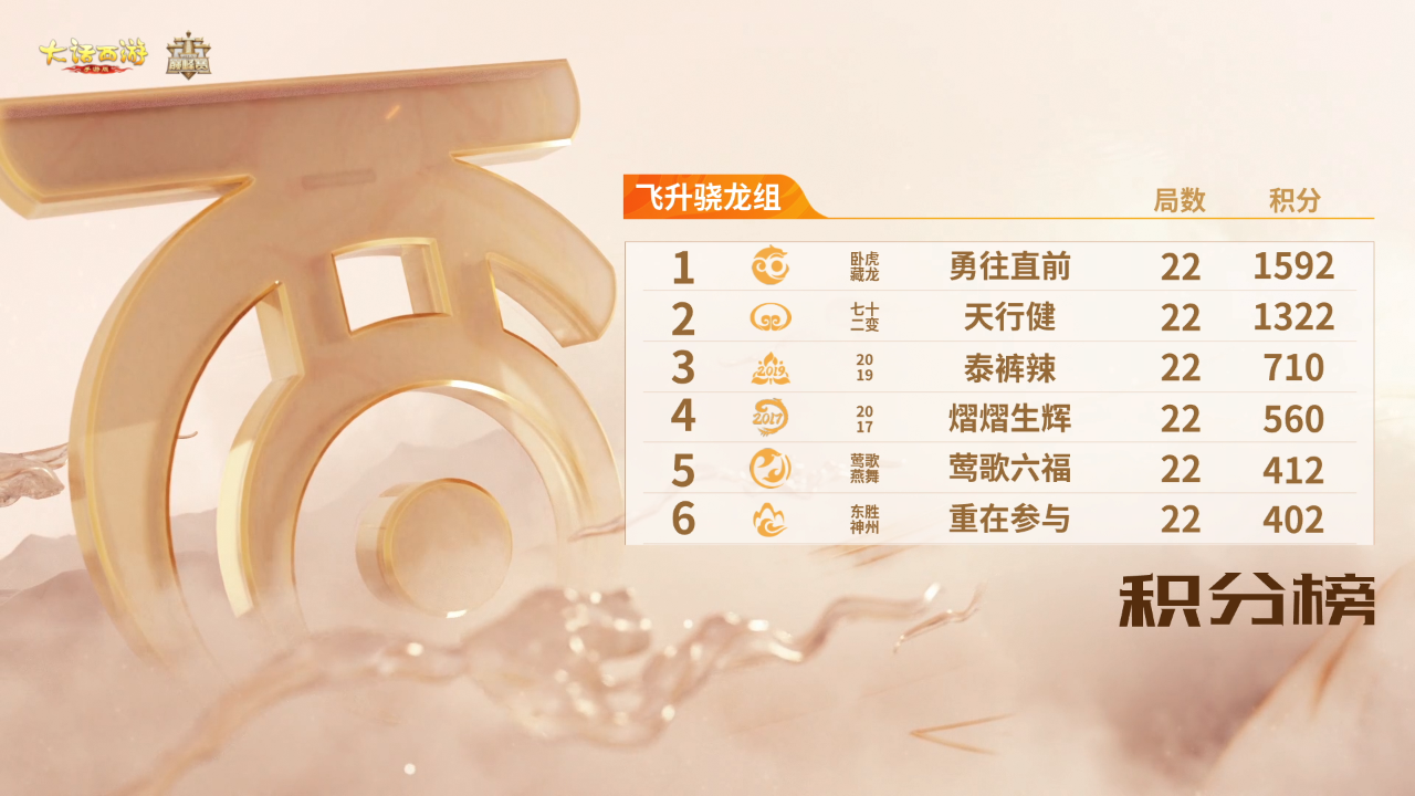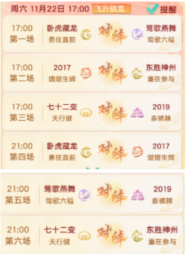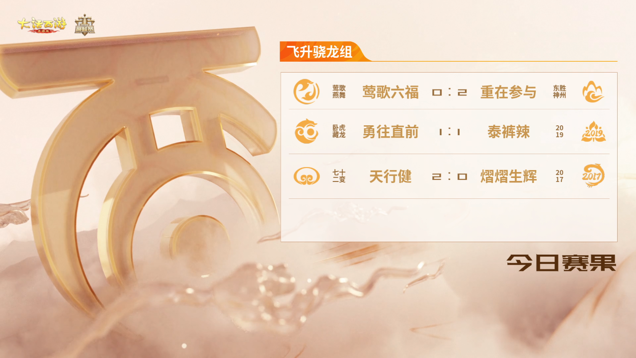 飞升骁龙组由『莺歌燕舞』服务器【莺歌六福】对阵『东胜神州』服务器【重在参与】,『卧虎藏龙』服务器【勇往直前】对阵『2019』服务器【泰裤辣】,『七十二变』服务器【天行健】对阵『2017』服务器【熠熠生辉】。