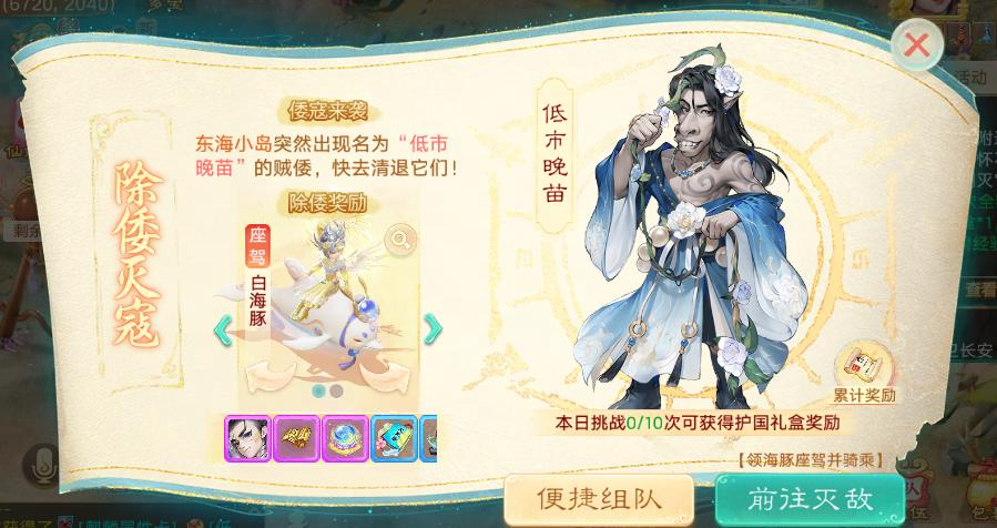 唐王震怒颁下诛寇令:即日起少侠组队讨寇,扬大唐神威!更是准备了绝版白海豚座驾、神兽浪淘沙作为谢礼,只待少侠前往一战!