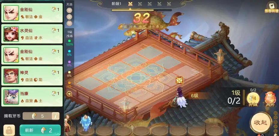 3)对局分为备战阶段和战斗阶段两部分,备战阶段少侠可以通过玩法内的牙币购买经验提升等级或招募召唤兽,利用召唤兽的不同特性和羁绊组建自己的战斗阵容;并且3个相同的召唤兽可以升阶,升阶后的召唤兽将更加强大;