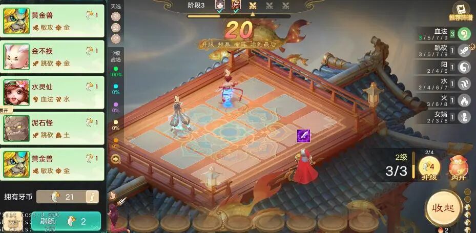 3)对局分为备战阶段和战斗阶段两部分,备战阶段少侠可以通过玩法内的牙币购买经验提升等级或招募召唤兽,利用召唤兽的不同特性和羁绊组建自己的战斗阵容;并且3个相同的召唤兽可以升阶,升阶后的召唤兽将更加强大;