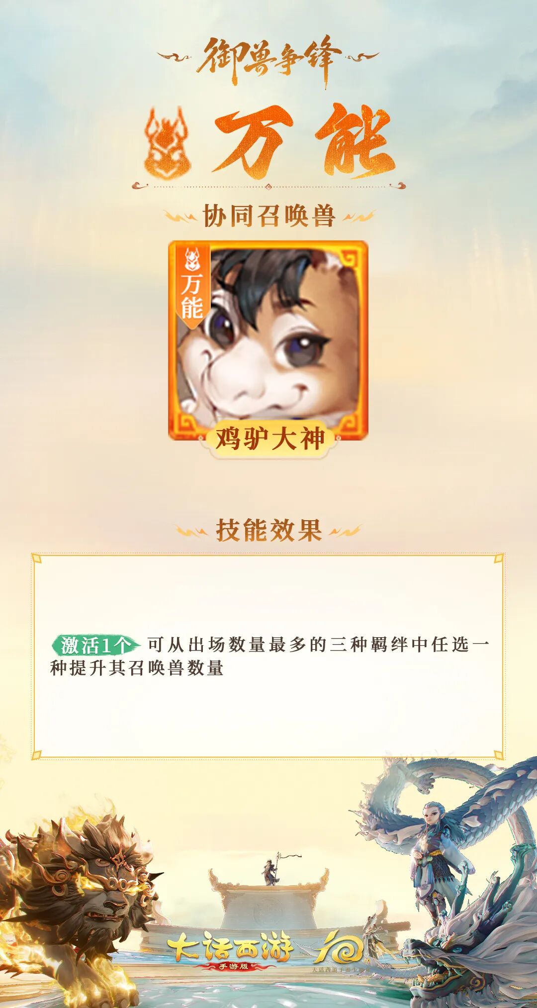 万能羁绊,可从出场数量最多的三种羁绊里选一种提升召唤兽数量,是阵容搭配的“灵活手”。能针对性补强核心羁绊的召唤兽规模,快速凑出高阶羁绊效果,让阵容成型速度和适配性大幅提升。