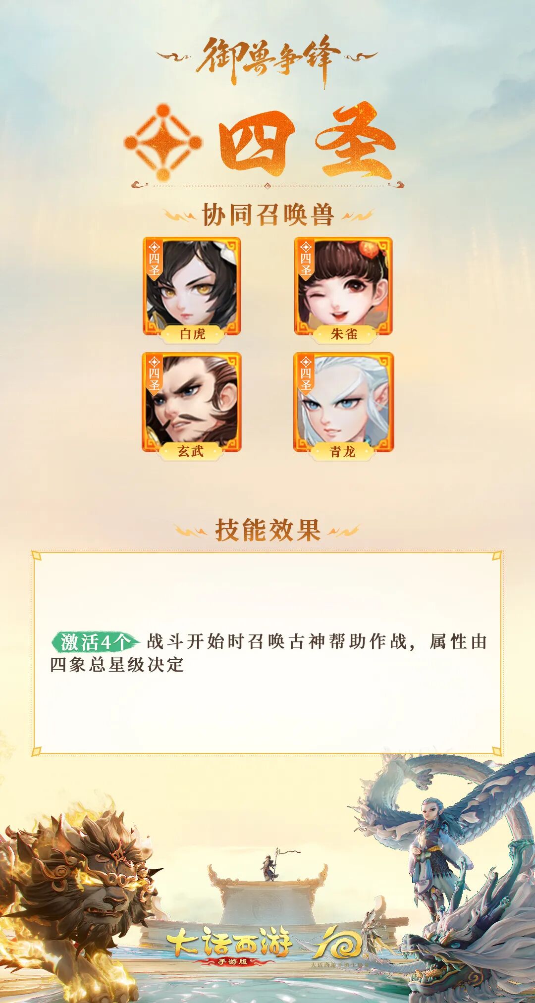 四圣羁绊,凑齐四个单位后,战斗可召唤古神助战(古神属性由四象总阶级决定),对局建立人数和战力优势,不管是抢节奏压制敌方,还是靠古神承伤保护己方核心召唤兽,都能发挥关键作用。